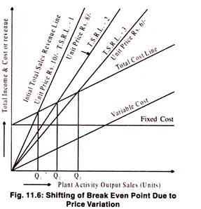 The shifting of break-even point due to price variation is drawn in Fig. 11.6. At different price levels, total revenue lines have been drawn in this figure. The figure shows that as the price of the product is reduced to B.E.P. shifts towards right side and vice-versa.