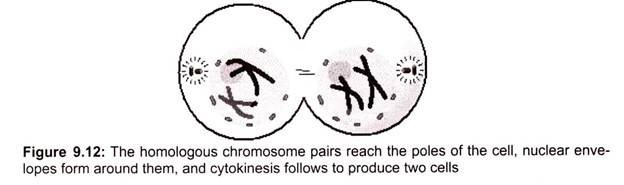 In Telophase I the homologous chromosome pairs complete their migration to the two poles as a result of the action of the spindle. Now a haploid set of chromosomes is at each pole, with each chromosome still having two chromatids. A nuclear envelope reforms around each chromosome set, the spindle disappears, and cytokinesis follows. In animal cells, cytokinesis involves the formation of a cleavage furrow, resulting in the pinching of the cell into two cells (Fig. 9.12). After cytokinesis, each of the two progeny cells has a nucleus with a haploid set of replicated chromosomes.