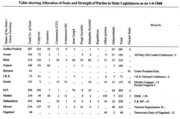 It was after this year that in several Indian states ‘Aya Ram and Gaya Ram’ process started. Party position in each state as on 1.4.1968 was as shown on pages 149-150.