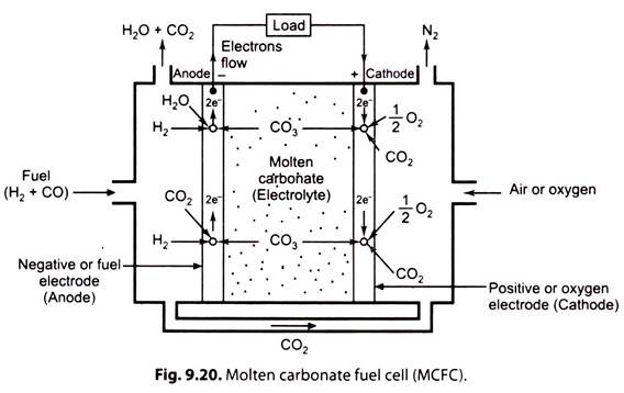 Since these salts can act as electrolytes only in liquid phase, the operating temperature should as high as 650°C. Fig. 9.20 shows the MCFC in which porous nickel is used as electrodes and electrolyte is held in a spong like ceramic matrix.