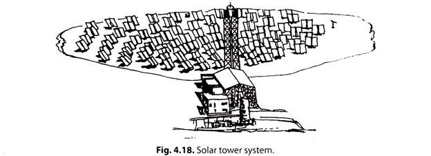 In case of a ‘solar farm’ temperature at the point of focus can reach several hundred degrees Celsius. Fig. 4.18 shows a solar tower system.
