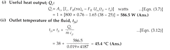 Given- Ics = 800 W/m2; Acs = 1m2; tfi = 38 °C; ta = 25 °C; FR (τα)e = 0.76; FR Uoc = 1.65 W/m2K; m = 0.019 kg/s/m2, cp = 4187 J/kg K.