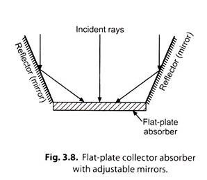 Fig. 3.8. shows a flat-plate collector with adjustable mirrors. It consists of a flat- plate collector facing south, with mirrors attached to its north and south edges. If the mirrors are set at the proper angle, they reflect solar radiation on to the absorber plate.