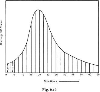 Inflow rate ordinates I1, I2, I3 etc. are read out from the inflow hydrograph at suitably chosen interval. Figure 9.10 shows an inflow hydrograph at 3 hours time interval and Fig. 9.12 shows an inflow hydrograph at 4 hours time interval.