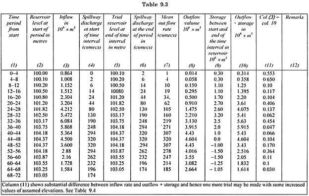 The trial and error method in Tables 9.3 and 9.4 can be replaced by Table 9.5 also. In Table 9.5 the reservoir elevation for each time interval is first adjusted before proceeding for subsequent time interval. Method of applying trials is better understood in Table 9.5 rather than Tables 9.3 and 9.4.