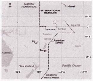 Note how it bends to include all of Kiribati, Samoa, Tonga and Tokelau in the Eastern Hemisphere. Immediately to the left of the International Date Line the date is always one day ahead of the date (or day) immediately to the right of the International Date Line in the Western Hemisphere.