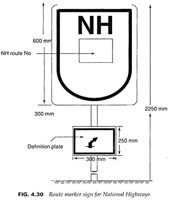 A route marker sign for national highways, standardised by the Indian roads congress, is shown Fig. 4.30.